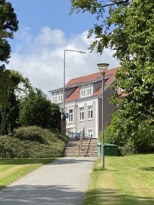 The property at Havnevej 7, Matr. 13 b Skive Markjorder, was built in 1905 as the Beværterforeningens Stiftelse for needy older colleagues and their wives. Beværterforeningen was founded on October 1, 1884. The property, designed by Isidor von Essen, is prominently located on the corner of Havnevej and Kielgastvej, and the harmonious facade is visible at the end of the sloping path as you walk up through the grounds from the fountain. The west gable has been decorated with gable painting in 2025.